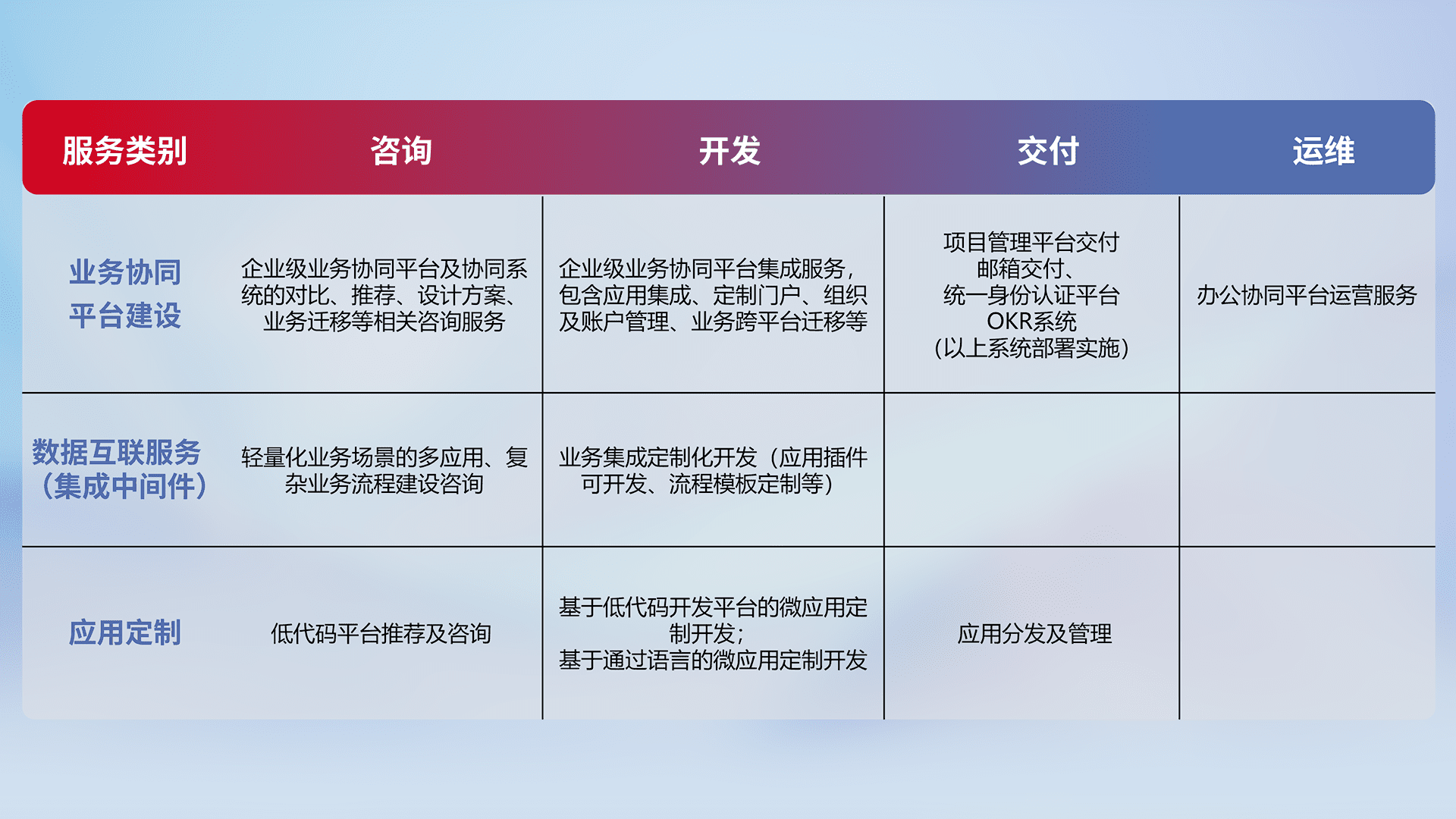 针对钉钉、、、企微、、IDaas等平台级产品提供产品的规划、、、方案、、、、交付、、、定制化开发等服务,,,,实现如统一协同办公、、、、智能客户服务、、混合会议管理、、、智能数据查询、、等业务场景,,,实现数字化转型。。。
